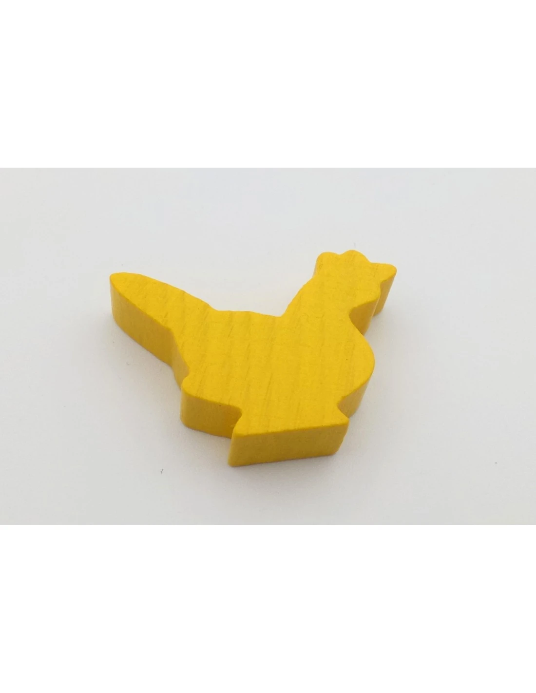 Geel gekleurde haan van hout. De afmetingen zijn ca. 3 cm lang, 2 cm hoog en 1 cm dik.