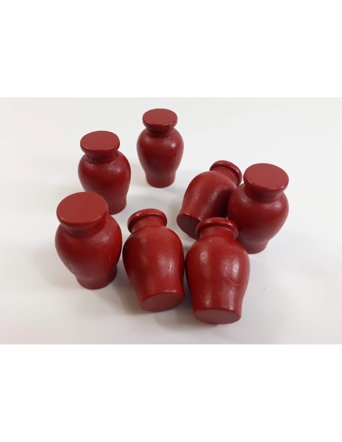Donker rode amfora van hout. De kruik is ongeveer 20x30mm groot.