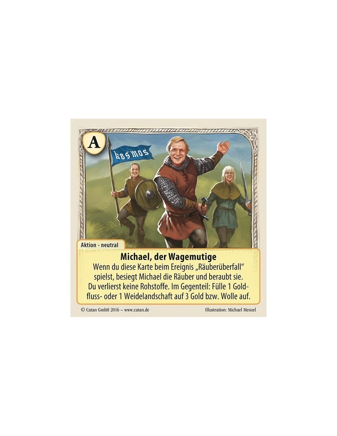 Wenn du diese Karte beim Ereignis “Räuberüberfall” spielst, besiegt Michael die Räuber und beraubt sie. Du verlierst keine Rohstoffe. Im Gegenteil: Fülle 1 Goldfluss- oder Weidelandschaft auf 3 Gold bzw. Wolle auf.