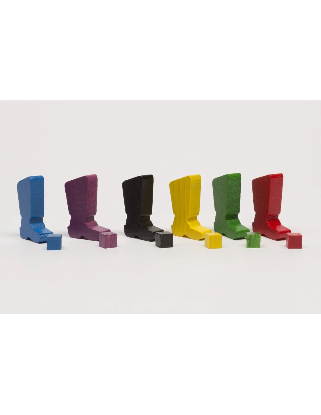 Set laarzen voor Elfenland. De set bestaat uit 6 houten laarzen in de kleuren rood, blauw, geel, groen, paars en zwart.