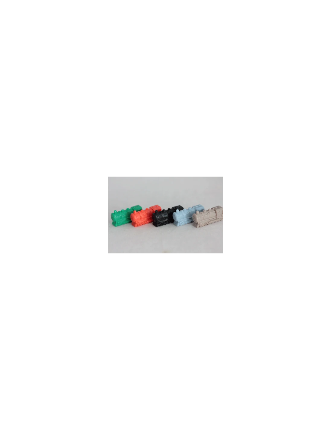 Set van 5 plastic treinen. Elke set bestaat uit een groene, oranje, zwarte, blauwe en grijze trein.