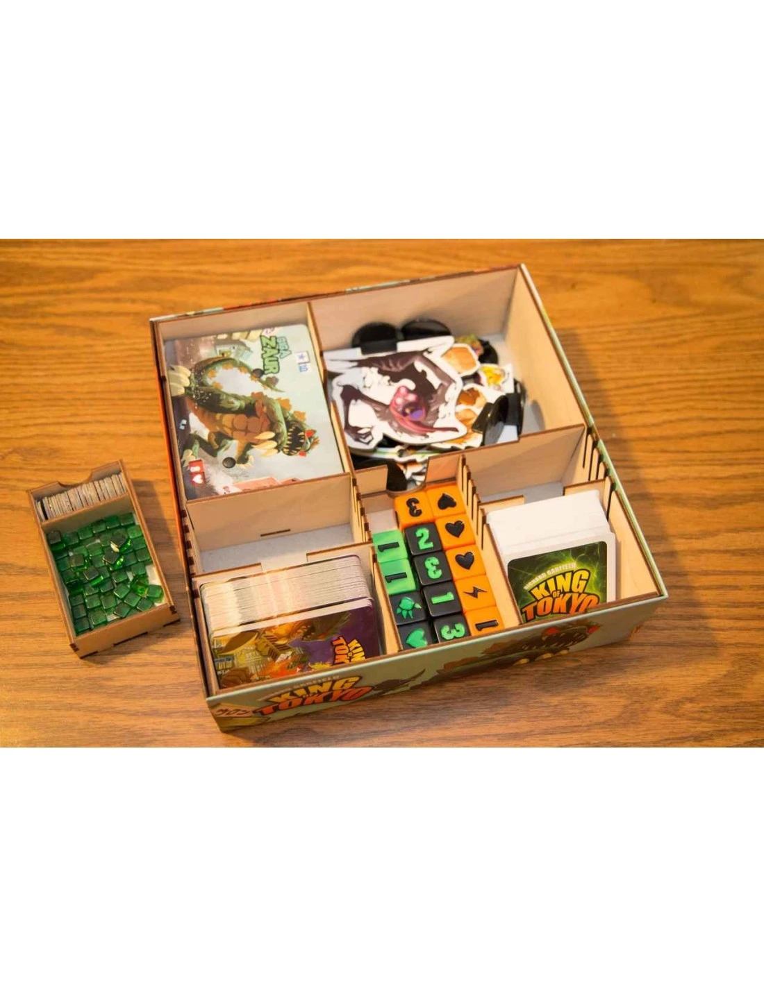 Get organized with our box organizer designed specifically for King of Tokyo. This organizer will keep your cards, dice, tokens and characters all in their proper place during transport. A removable tray containing the tokens and energy cubes can be taken from the box and placed on the table. Adjustable dividers allow for storing sleeved or unsleeved cards.